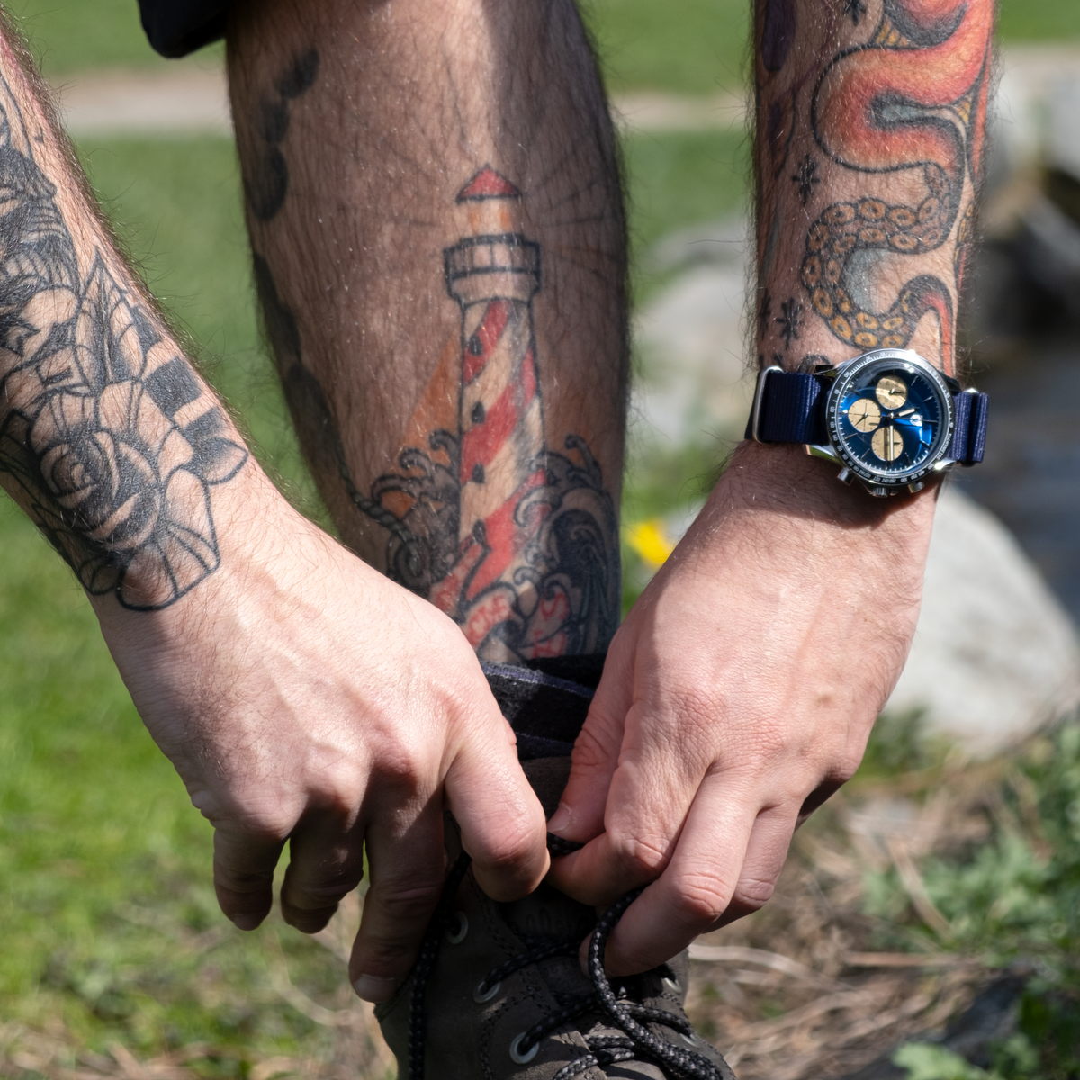 The Oceanic watch is a revival of the timeless sports watch designs of the 1970s. Inspired by the jet-set style of the era, this 40mm chronograph timepiece combines golden subdials with a deep blue backdrop for a nautical theme. Crafted from stainless steel and hardened domed crystal, its vintage design is stamped with the MT&W crest and finished with our unique aged patina effect.