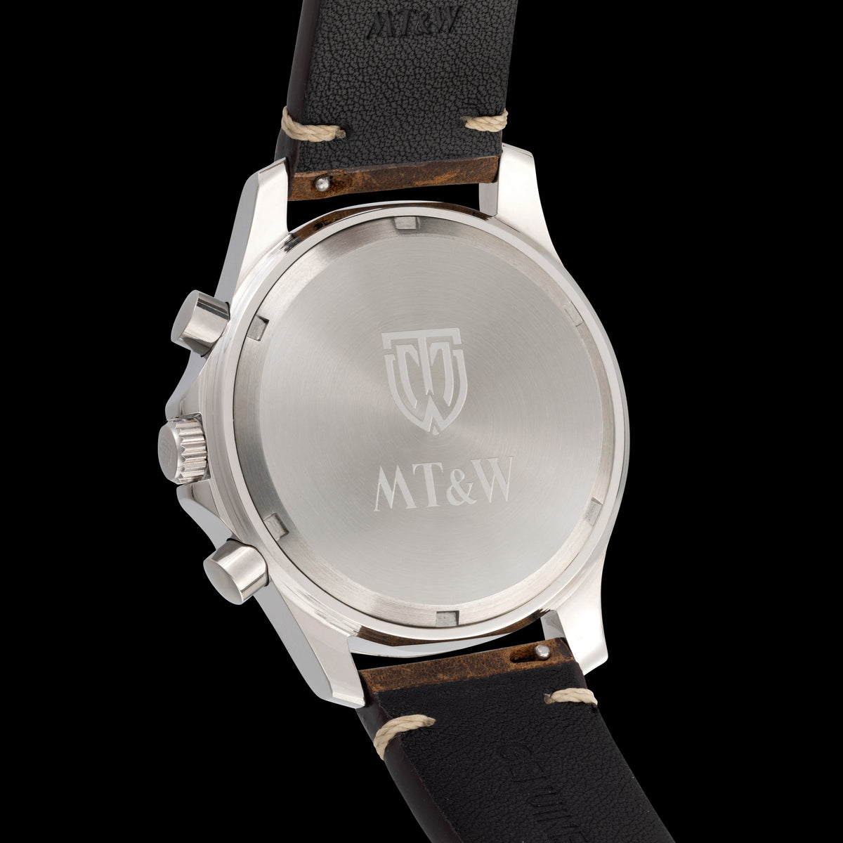 The Racing Green watch is a celebration of the golden age of sports timepieces, with a metallic green dial that nods to the vibrant hues of classic 20th-century sports cars. The three subdials add to the vintage aesthetic of the design with our signature aged patina effect, while the 40mm stainless steel case is finished with an engraved MT&W crest.