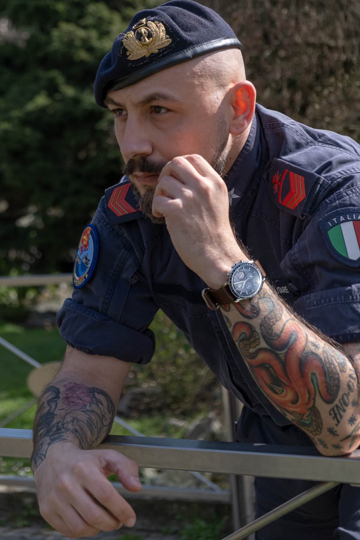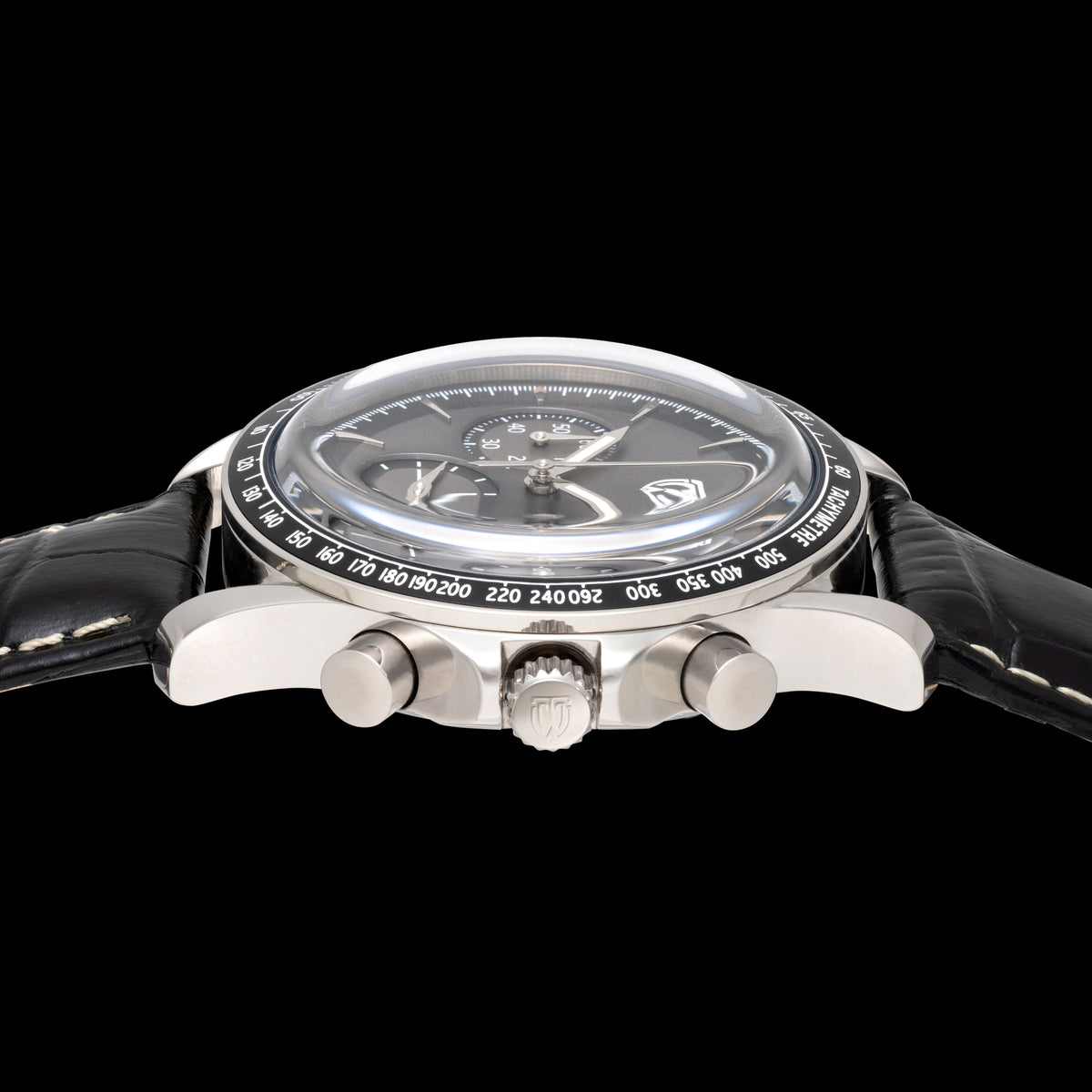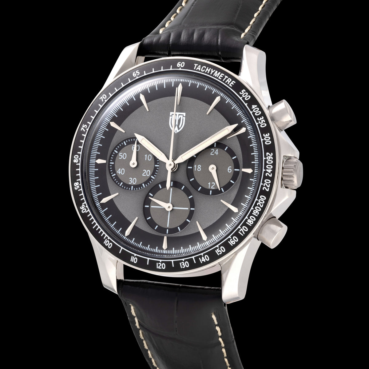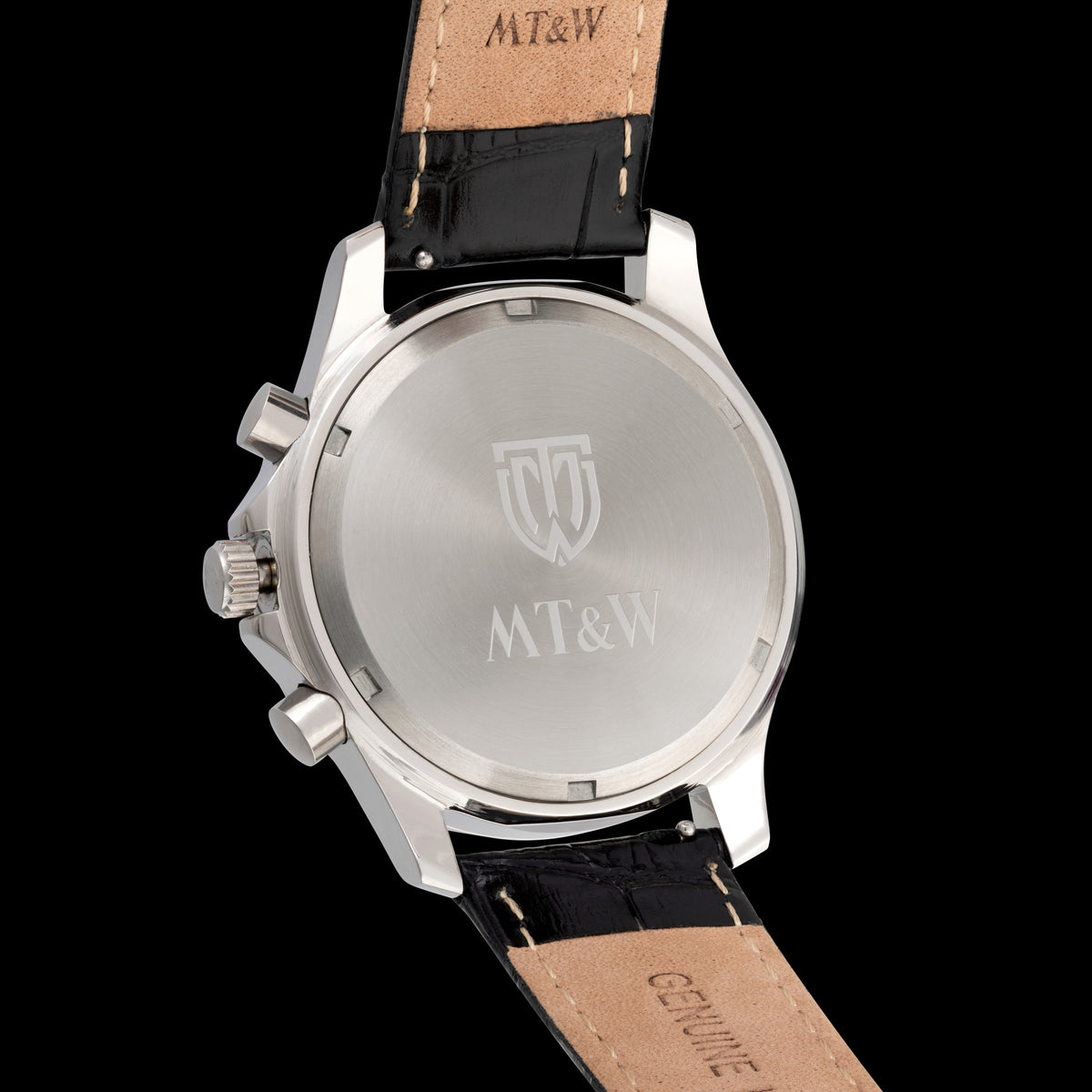 The Steel Grey watch is designed as a love letter to the vintage sports timepieces of the 1970s. Engraved with the MT&W emblem, its polished stainless steel case complements the monochrome colourway of its 40mm dial and bezel. The combination of subtle grey tones and bold white markings bring to mind the rev counters and pressure gauges found in classic Formula 1 cockpits.